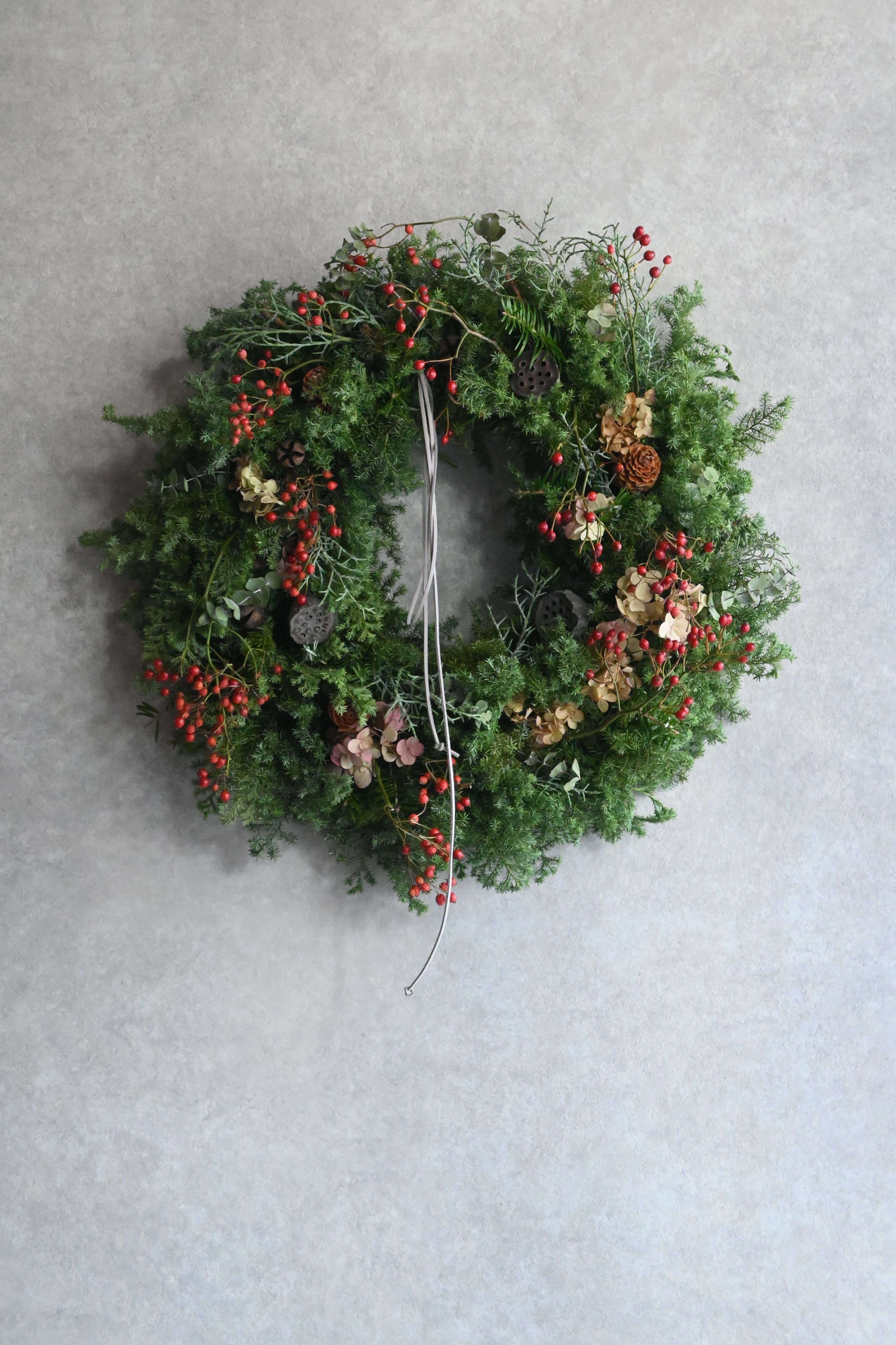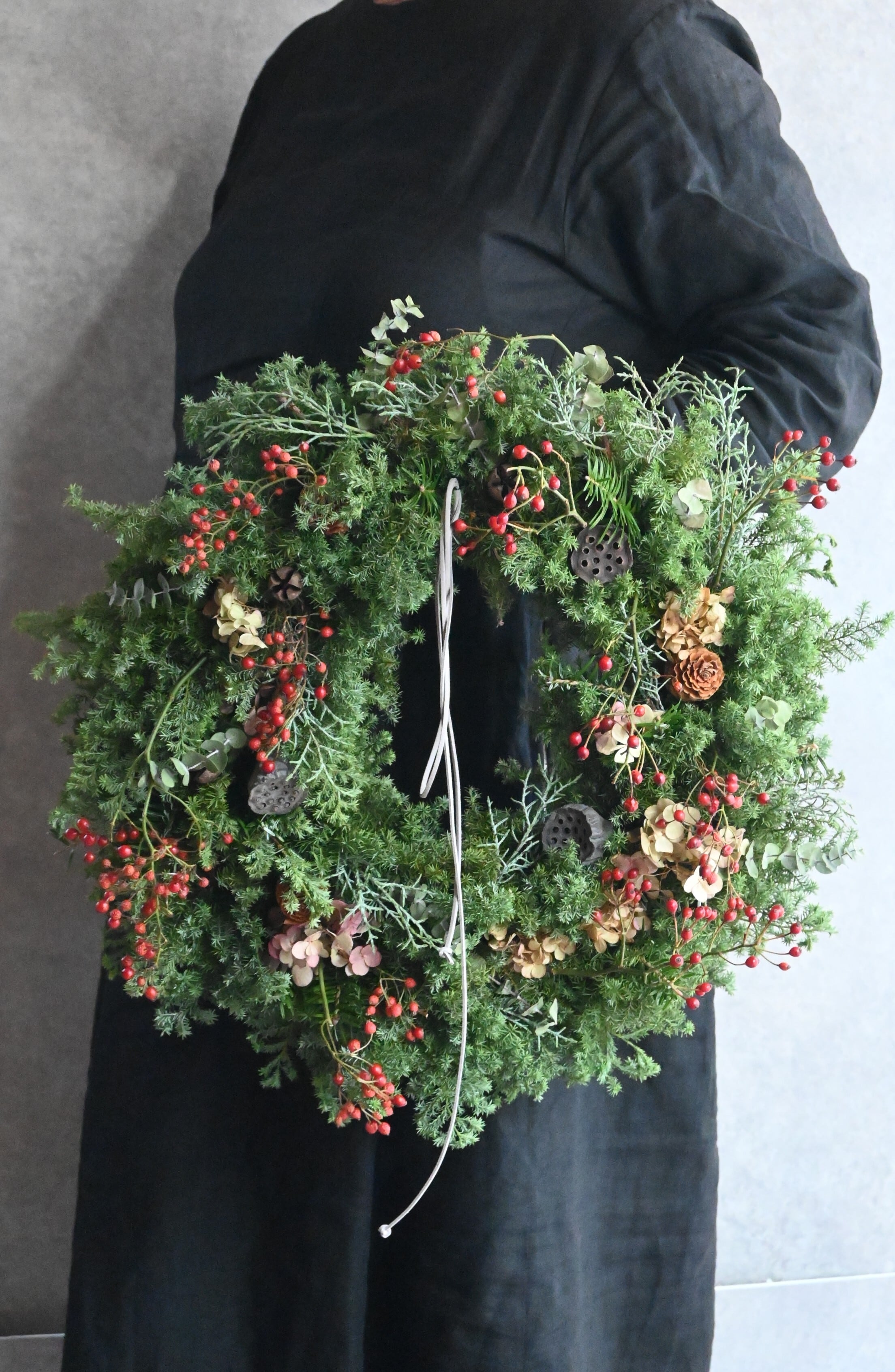 リースにはモミ、ヒムロスギ、ブルーアイス、ユーカリ2種類が入ります。