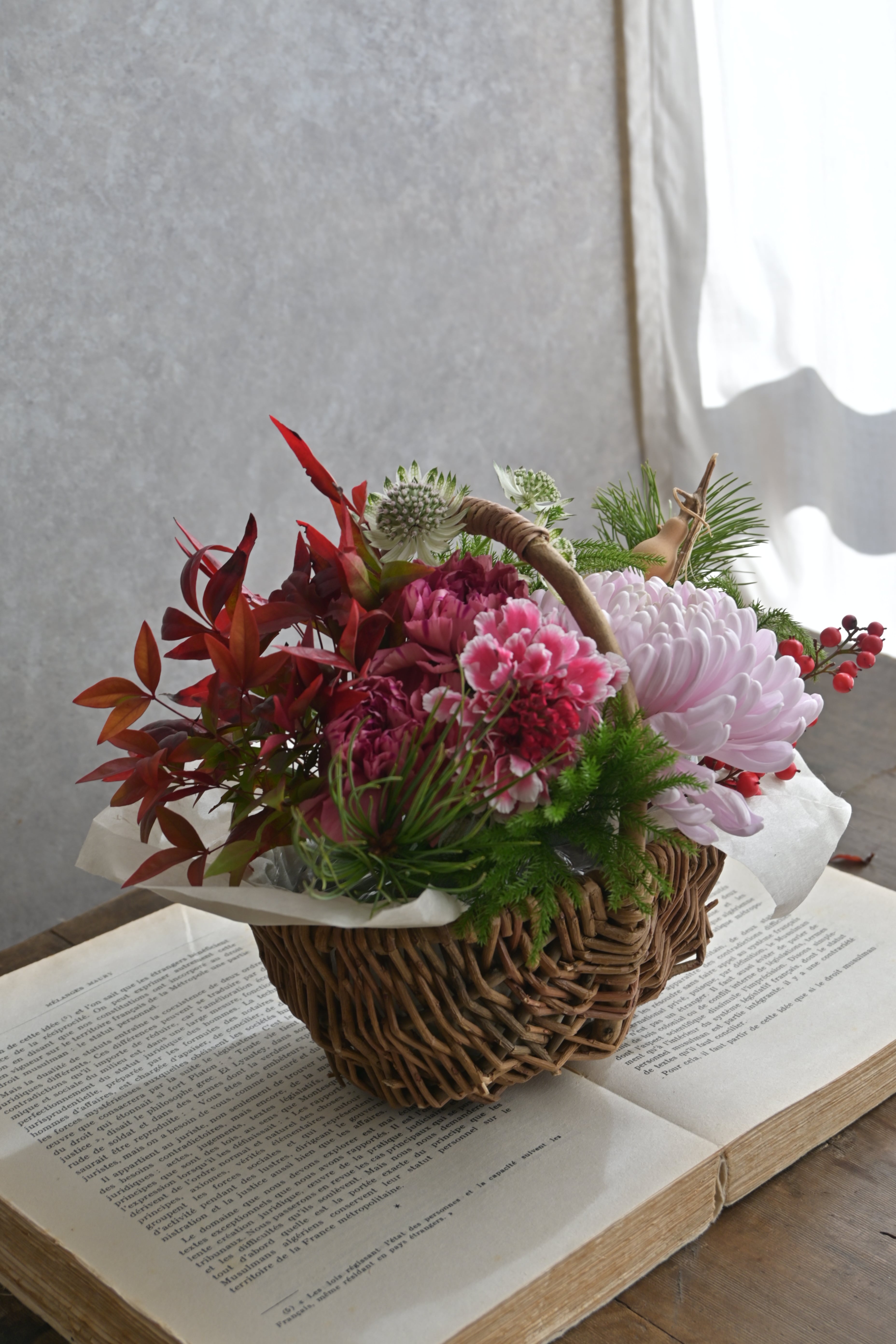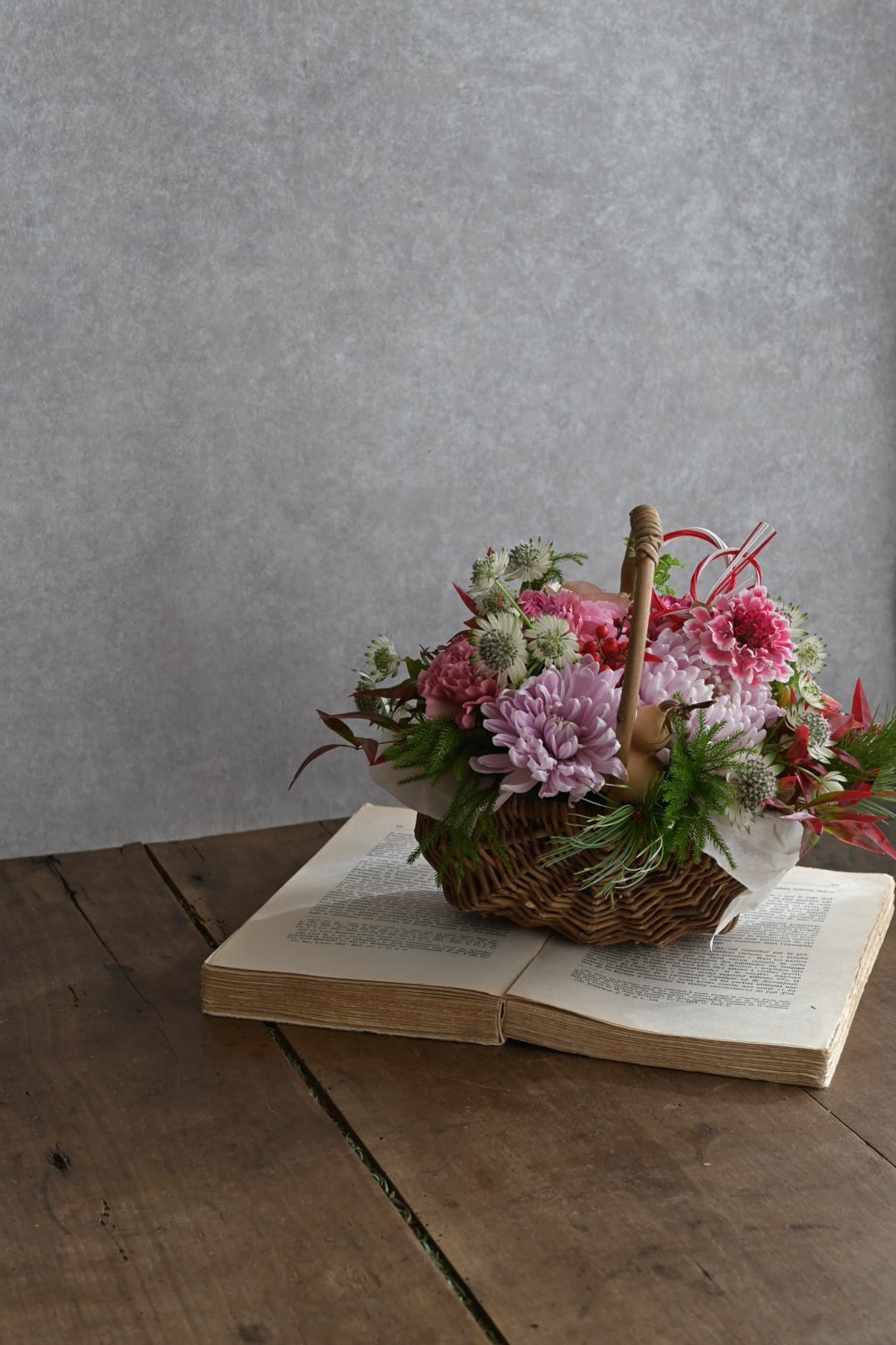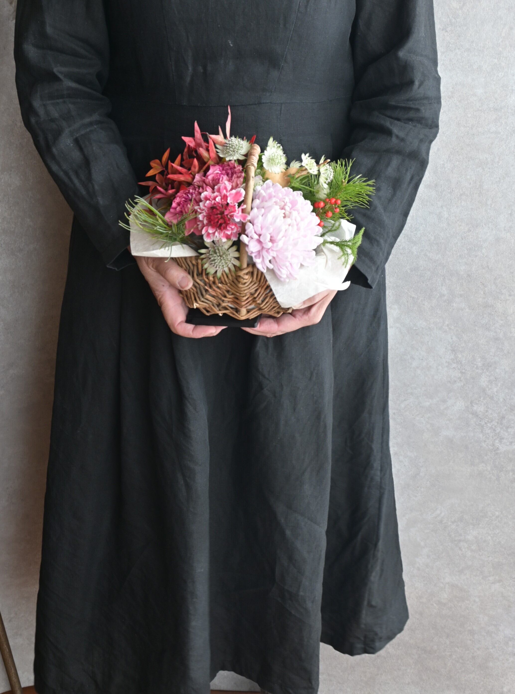 手持ちの籠にお花を生けました。小さいひょうたんがちょこんとのっています。